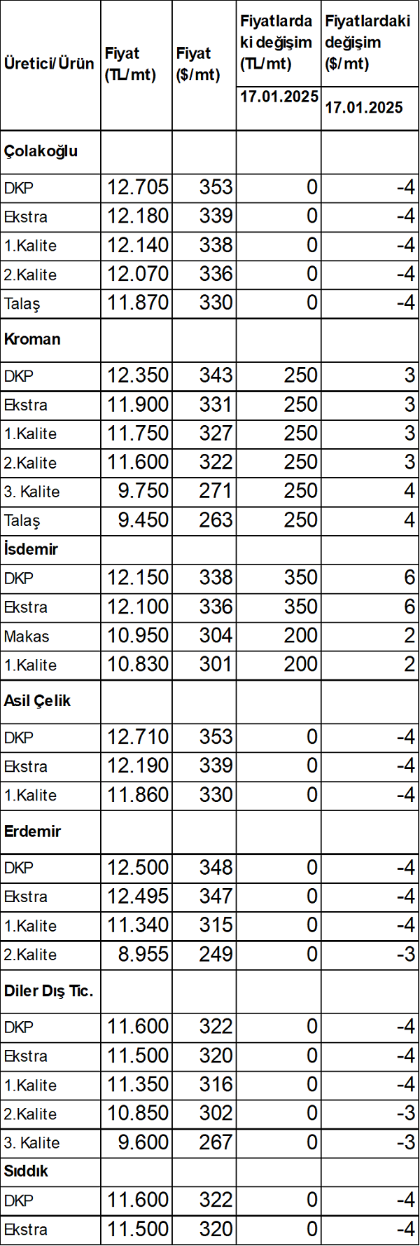 Yukarıdaki fiyatlar müşteri teslim bazındadır ve KDV dâhil değildir. Dolar bazındaki değişim, kurdaki dalgalanmalar göz önüne alınarak hesaplanmaktadır.