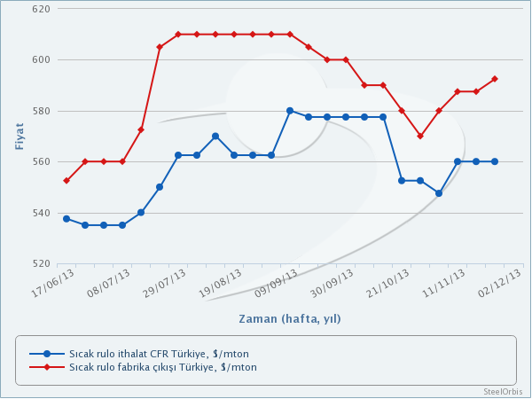 Diğer taraftan henüz yeni teklifleri belli olmayan diğer ülkelerden Türkiye'ye verilmiş en son teklif seviyeleri ise şöyledir: Romanya'dan verilen teklifler sıcak rulo için 565-575$/mt CFR, soğuk rulo için ise 680-690$/mt CFR aralığındaydı. Slovakya çıkışlı sıcak rulo teklifleri 560-565$/mt CFR, İtalya'dan verilen sıcak rulo fiyatları ise 495-505€/mt (678-692$/mt) CFR seviyelerinde bulunuyordu.