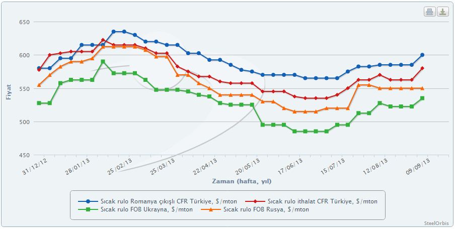 Türkiye piyasasına verilen Romanya çıkışlı sıcak rulo teklifleri 595-605$/mt CFR, soğuk rulo teklifleri ise 705-710$/mt CFR aralığında bulunuyor. Ukrayna'dan verilen teklifler sıcak rulo için 540-545$/mt CFR, soğuk rulo için ise 630-640$/mt CFR aralığında yer alırken; Slovakya çıkışlı sıcak rulo teklifleri 600-605$/mt CFR, Rusya menşeli sıcak rulo teklifleri 570-575$/mt CFR, İtalya'dan verilenler ise 610-615$/mt CFR seviyelerinde bulunuyor.