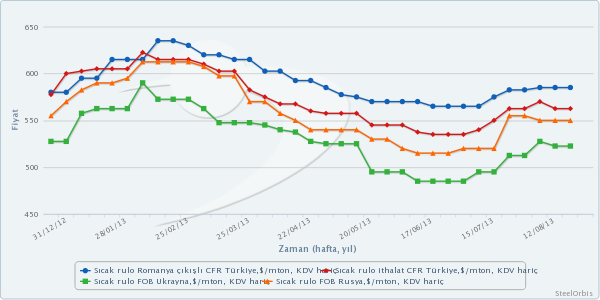 Buna göre; Türkiye'ye verilen en son teklifler ile bağlantı seviyeleri şu şekildedir: Rusya'dan verilen sıcak rulo teklifleri 565-585$/mt CFR seviyesindeyken, Rusya çıkışlı soğuk rulo teklifleri ise 640-660$/mt CFR aralığında yer almaktaydı. Bununla birlikte, Romanya çıkışlı sıcak rulo teklifleri 580-590$/mt CFR, soğuk rulo teklifleri ise 690-700$/mt CFR aralığında bulunuyordu. Son olarak, Ukrayna'dan Türkiye piyasasına verilen sıcak rulo teklifleri 535-540$/mt CFR aralığında değişirken, ülkenin soğuk rulo teklifleri ise 620-625$/mt CFR seviyesinde yer almaktaydı.