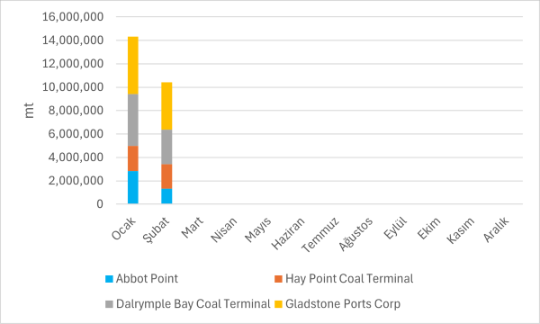 North Queensland Bulk Ports Corporation ve Gladstone Ports Corporation tarafından yayımlanan verilere göre bu yılın Şubat ayında Avustralya’nın Queensland eyaletinde yer alan Hay Point, Dalrymple Bay, Abbot Point ve Gladstone terminallerinden yapılan kömür ihracatı aylık %27,2 ve yıllık %35,4 artışla 10,42 milyon mt seviyesinde yer aldı.