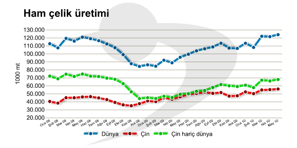 Bununla birlikte, 2010 yılının ilk beş ayında dünya ham çelik üretimi geçen yılın aynı dönemine göre %29,8 artarak 586,06 milyon mt seviyesine ulaştı.