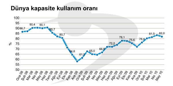 Söz konusu ayda, dünya ham çelik üretiminde, sonuçları değerlendirilen 66 ülkenin kapasite kullanım oranı, 2009 yılı mayıs ayına göre 15 yüzde puan artarken, bu yılın nisan ayında kapasite kullanım oranı %83,4 seviyesindeydi.