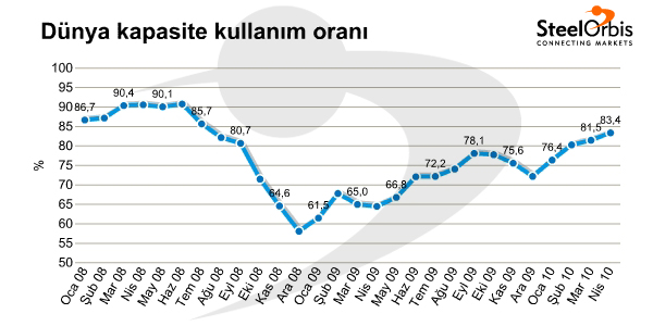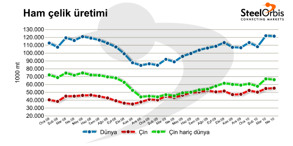 Bununla birlikte, 2010 yılının ilk dört ayında dünya ham çelik üretimi geçen yılın aynı dönemine göre %31,8 artarak 467,8 milyon mt seviyesine ulaştı.