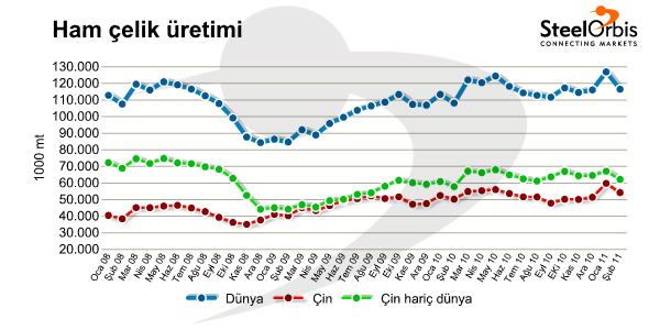 Dünya Çelik Üreticileri Birliği'nin (worldsteel) 21 Mart tarihinde yayımladığı dünya ham çelik üretimi ön verilerine göre, bu yılın şubat ayında dünya ham çelik üretimi, yıllık %8,8 oranında artış, ocak ayına göre ise %8,22 düşüşle 116,57 milyon mt seviyesinde kaydedildi. Ancak şubat ayında, ocak ayından daha az iş günü olduğu göz önünde bulundurulmalıdır.