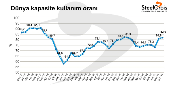 Şubat ayında, dünya ham çelik üretiminde, sonuçları değerlendirilen 64 ülkenin kapasite kullanım oranı %82 seviyesinde gerçekleşirken, ocak ayında kapasite kullanım oranı gözden geçirilmiş verilere göre %80,9 seviyesindeydi. Bununla birlikte, şubat ayı kapasite kullanım oranı 2010 yılı şubat ayına göre 2,7 puan daha yüksek.