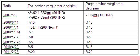 Hindistan'ın 2007 yılından bu yana uyguladığı demir cevheri ihracat vergisi oranları: