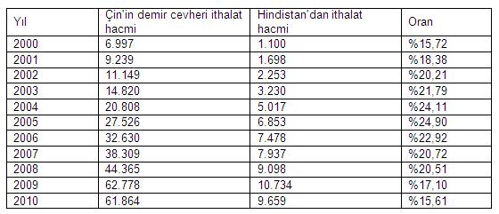 2000 yılından beri Çin'in Hindistan'dan demir cevheri ithalatı ve bunun toplam cevher ithalatına oranı yıllık bazda şu şekilde gerçekleşti:
