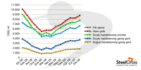 Japon Demir-Çelik Federasyonu (JISF) tarafından yayımlanan verilere göre, 2009 yılı ekim ayında Japonya'nın pik demir üretimi, 2008 yılı ekim ayına göre %9,3 düşüş, bu yılın Ağustos ayına göre ise %9,3 artışla 6,61 milyon mt olurken, ülkenin ham çelik üretimi, bir önceki yılın aynı dönemine göre %12,9 düşüş, bu yılın eylül ayına göre ise %6,4 oranında artışla 8,80 milyon mt seviyesine ulaştı.