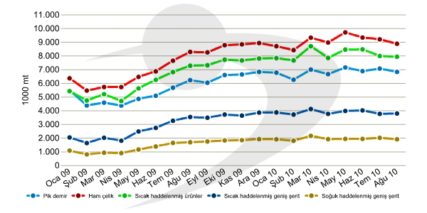 Bununla birlikte, 2010 yılının ocak-ağustos döneminde, ülkenin pik demir üretimi, 2009 yılının aynı dönemine göre %34,1 artışla 54,69 milyon mt, ham çelik üretimi ise %38,1 artışla 72,7 milyon mt seviyesine ulaştı.