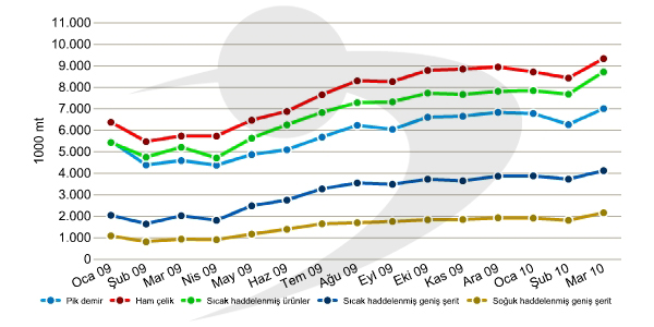 Bununla birlikte, 2010 yılının ilk çeyreğinde, ülkenin pik demir üretimi, 2009 yılının aynı dönemine göre %38,5 artışla 20,07 milyon mt, ham çelik üretimi ise %50,7 artışla 26,41 milyon mt seviyesine ulaştı.