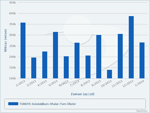 Türkiye İstatistik Kurumu (TÜİK) tarafından sağlanan verilere göre, bu yılın ocak ayında Türkiye'nin kütük ve blum ithalatı 2013 yılının ocak ayına göre %28,96 artış, önceki aralık ayına göre ise %31,43 düşüşle 266.816 mt seviyesinde kaydedildi. Bu ithalatın değeri ise yıllık bazda %24,13 artış, bir önceki aya göre ise %30,61 düşüşle 145,38 milyon $ oldu.