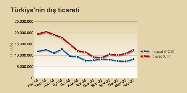Türkiye İstatistik Kurumu (TÜİK) ve Gümrük Müsteşarlığı tarafından derlenen dış ticaret ön verilerine göre, 2009 yılı Haziran ayında Türkiye'nin toplam ihracatı, 2008 yılının aynı ayına göre %29,2 oranında azalarak 8,332 milyar $ olurken, ülkenin ithalatı %35,9 oranında düşüşle 12,438 milyar $ seviyesinde gerçekleşmiştir. Aynı dönemde dış ticaret açığı %46,1 azalarak 7,706 milyar $ seviyesinden, 4,152 milyar $ seviyesine gerilemiştir.