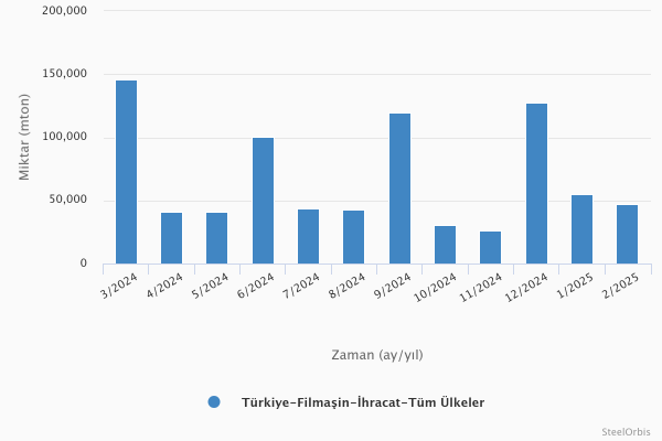 Türkiye İstatistik Kurumu (TÜİK) tarafından sağlanan verilere göre, ülkenin filmaşin ihracatı Şubat ayında aylık %15,3 ve yıllık %66,7 düşüşle 46.869 mt seviyesinde kaydedildi. Bu ihracattan sağlanan gelir aylık %16 ve 2024 yılının Şubat ayına kıyasla %69,5 düşüşle 26,99 milyon $ oldu.