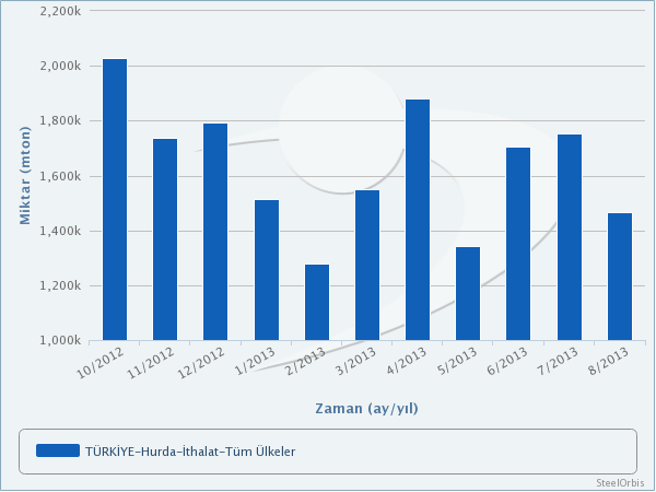 Türkiye İstatistik Kurumu (TÜİK) tarafından sağlanan verilere göre, bu yılın ağustos ayında Türkiye'nin hurda ithalatı yıllık %15,57 düşüş göstererek 1.468.550 metrik ton olarak gerçekleşirken, temmuz ayına göre %16 oranında geriledi. Bu ithalatın değeri ise 2012 yılının ağustos ayına göre %23 ve temmuz ayına göre %16 azalmayla toplam 524 milyon $ oldu.