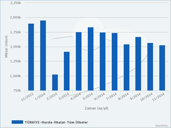 Türkiye İstatistik Kurumu (TÜİK) tarafından sağlanan verilere göre, 2014 yılının kasım ayında Türkiye’nin hurda ithalatı yıllık %16,6 artışla 1,53 milyon metrik tona yükselirken, bir önceki aya kıyasla %2,5 düşüş yaşadı. Bu ithalatın değeri ise aylık %5,6 düşüş ve yıllık %15,2 artışla 564,4 milyon $ olarak kaydedildi.
