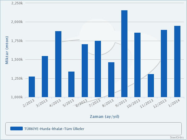 Türkiye İstatistik Kurumu (TÜİK) tarafından sağlanan verilere göre, bu yılın ocak ayında Türkiye'nin hurda ithalatı 2013 yılının ocak ayına göre %28,76 artış göstererek 1,95 milyon mt olarak gerçekleşirken, aralık ayına göre %2,75 oranında yükseldi. Bu ithalatın değeri ise 2013 yılının ocak ayına göre %28,57 ve bir önceki aya göre %6,35 artışla toplam 766,49 milyon $ seviyesine yükseldi.