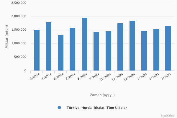 2025 yılının ilk üç ayında ise, Türkiye'nin hurda ithalatı yıllık %11,7 düşüşle 4,69 milyon mt olurken, bu ithalatın değeri ise yıllık %23,5 düşüşle 1,75 milyar $ seviyesinde yer aldı.