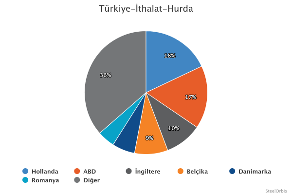 Aynı dönemde, Türkiye'nin en fazla hurda ithal ettiği ülke, yıllık %4,9 artışla 842.805 mt hurda ithalatı yapılan Hollanda oldu. Hollanda’yı Türkiye'ye yıllık %23,1 düşüşle 776.294 mt hurda ihraç eden ABD ve %20,7 düşüşle 457.603 mt hurda ihraç eden İngiltere takip etti.