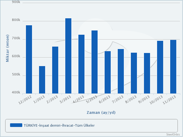 Türkiye İstatistik Kurumu (TÜİK) tarafından sağlanan verilere göre, geçtiğimiz yılın kasım ayında Türkiye'nin inşaat demiri ihracatı 2012 yılının aynı ayına göre %13,96 artışla 697.280 metrik ton olarak gerçekleşirken, ekim ayına göre %0,61 artış kaydetti. Bununla birlikte bu ihracattan elde edilen gelir, yıllık bazda %11,32, bir önceki aya göre %0,68 yükselişle toplam 400,57 milyon $ seviyesinde gerçekleşti.