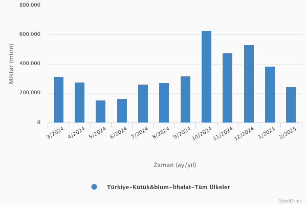 Türkiye İstatistik Kurumu (TÜİK) tarafından sağlanan verilere göre ülkenin kütük ve blum ithalatı bu yılın Şubat ayında aylık %36,9 düşüş ve yıllık %9,9 artışla 243.110 mt seviyesinde kaydedildi. Bu ithalatın değeri aylık %34,6 ve 2024 yılının Şubat ayına kıyasla %0,8 düşüşle 128,71 milyon $ oldu.