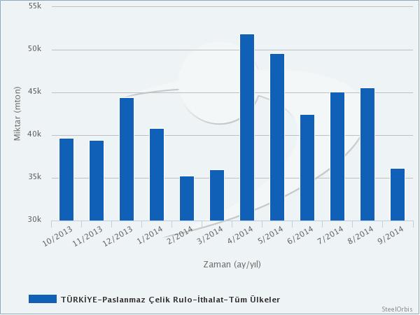 Türkiye İstatistik Kurumu (TÜİK) tarafından sağlanan verilere göre, Türkiye'nin paslanmaz yassı çelik ithalatı eylül ayında ağustos ayına göre %20,68, 2013 yılının eylül ayına göre ise %13,35 düşüşle 36.132 mt seviyesinde geriledi. Bu ithalatın değeri ise ağustos ayına göre %19,39, yıllık bazda %11,01 düşüşle 85,36 milyon $ olarak kaydedildi.