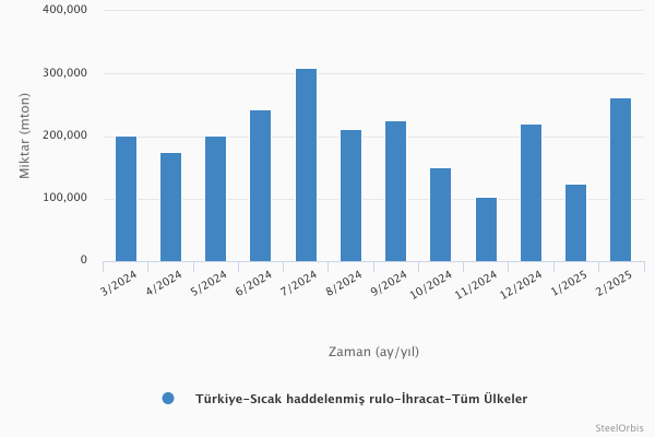 Türkiye İstatistik Kurumu (TÜİK) tarafından sağlanan verilere göre ülkenin sıcak rulo sac ihracatı Şubat ayında aylık %112,8 ve yıllık %59,7 artışla 262.831 mt seviyesinde kaydedildi. Bu ihracattan sağlanan gelir aylık %102,3 düşüş ve 2024 yılının Şubat ayına kıyasla %33,7 artışla 146,46 milyon $ oldu.