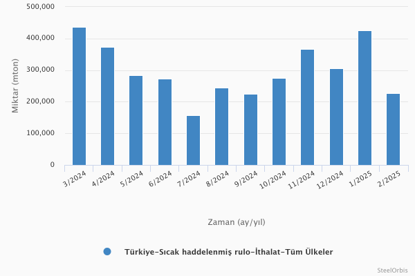 Türkiye İstatistik Kurumu (TÜİK) tarafından sağlanan verilere göre ülkenin sıcak rulo sac ithalatı Şubat ayında aylık %46,7 ve yıllık %10 düşüşle 226.689 mt seviyesinde kaydedildi. Bu ithalatın değeri aylık %46,7 ve 2024 yılının Şubat ayına kıyasla %20,4 düşüşle 126,77 milyon $ oldu.